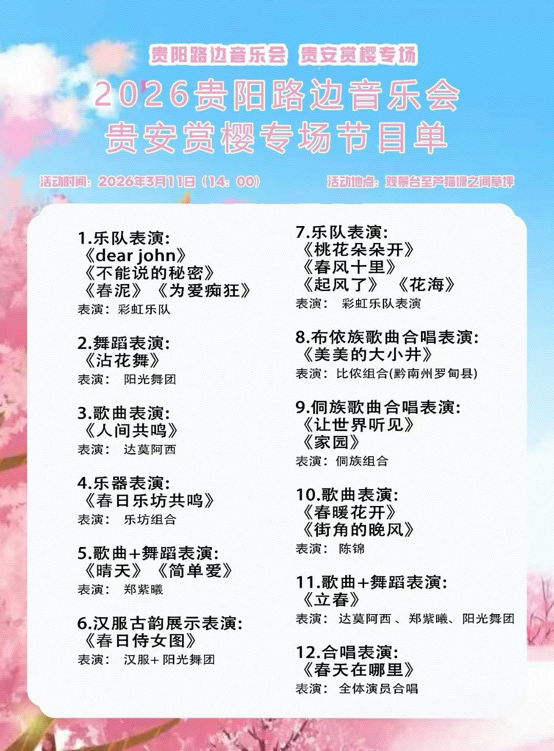 活动当日13点30分开始暖场,14点正式启幕。专场演出紧扣“春日”核心,精心遴选了一系列耳熟能详的经典曲目,《立春》《春暖花开》《春泥》《桃花朵朵开》等歌曲将娓娓诉说春日美好,更有布依族、侗族等充满贵州民族特色的歌曲倾情演绎,让传统民族文化在花海与旋律中焕发新生,让市民游客在赏樱听乐间,感受传统文化与现代潮流的碰撞之美。